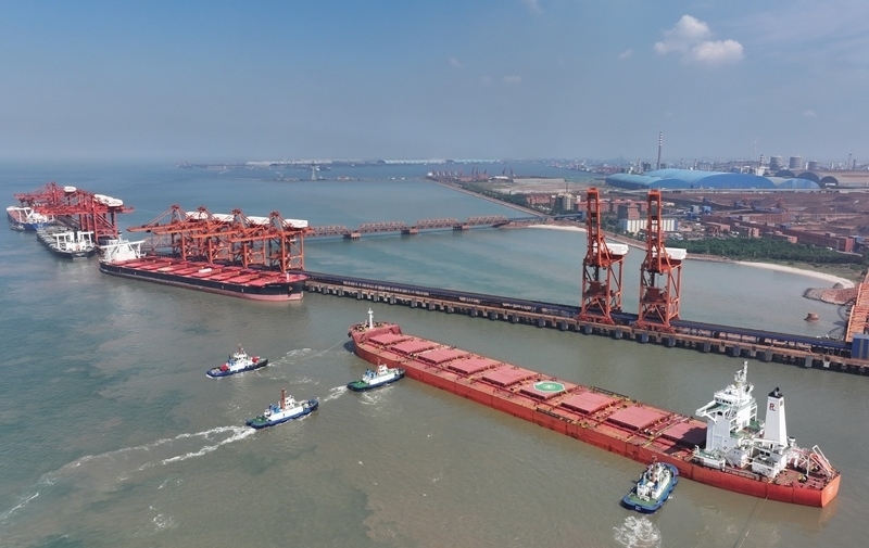 7月18日,輪船在拖輪的協(xié)助下向唐山港曹妃甸港區(qū)礦石碼頭靠泊(無人機(jī)照片)。