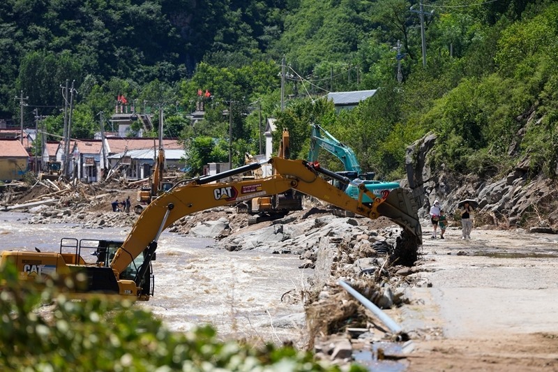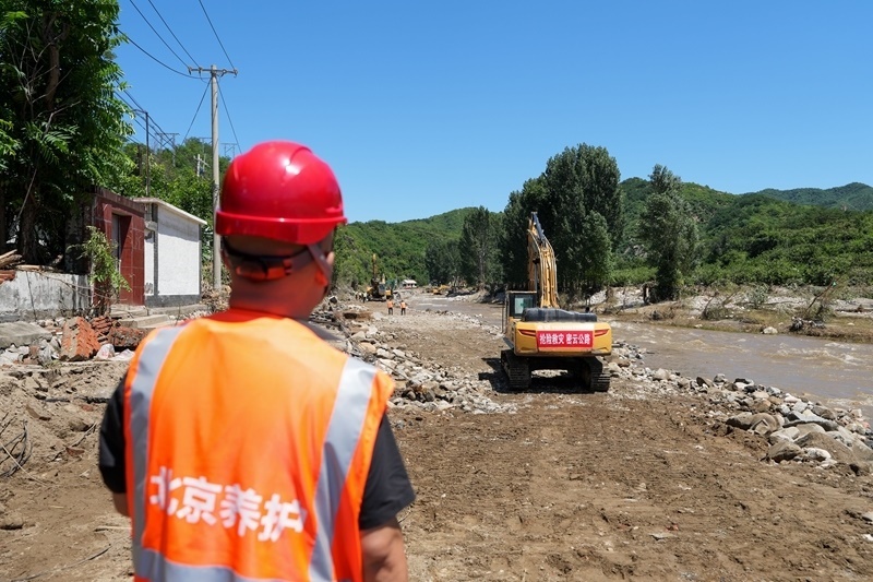 7月30日,在北京市密云區(qū)馮家峪鎮(zhèn),道路搶修人員恢復(fù)被洪水沖斷的道路。