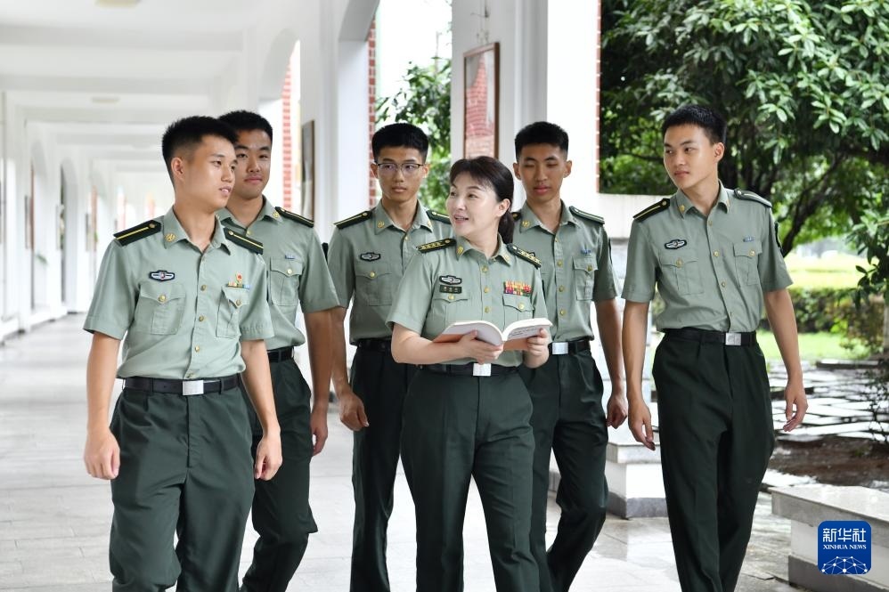 國(guó)防科技大學(xué)軍政基礎(chǔ)教育學(xué)院教授傅婉娟(右三)與學(xué)員們一起討論教材內(nèi)容 (7月22日攝)。新華社發(fā)(王驍 攝)