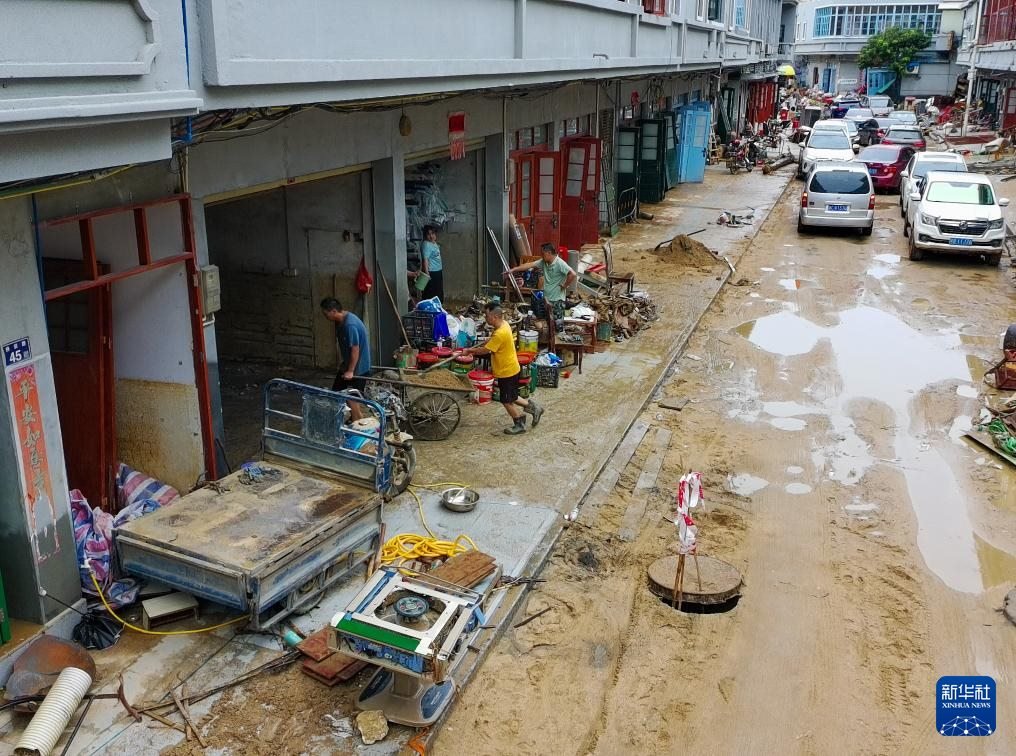 8月6日,村民在廣東清遠佛岡縣石角鎮(zhèn)黃花村清理屋內(nèi)淤泥與雜物(無人機照片)。
