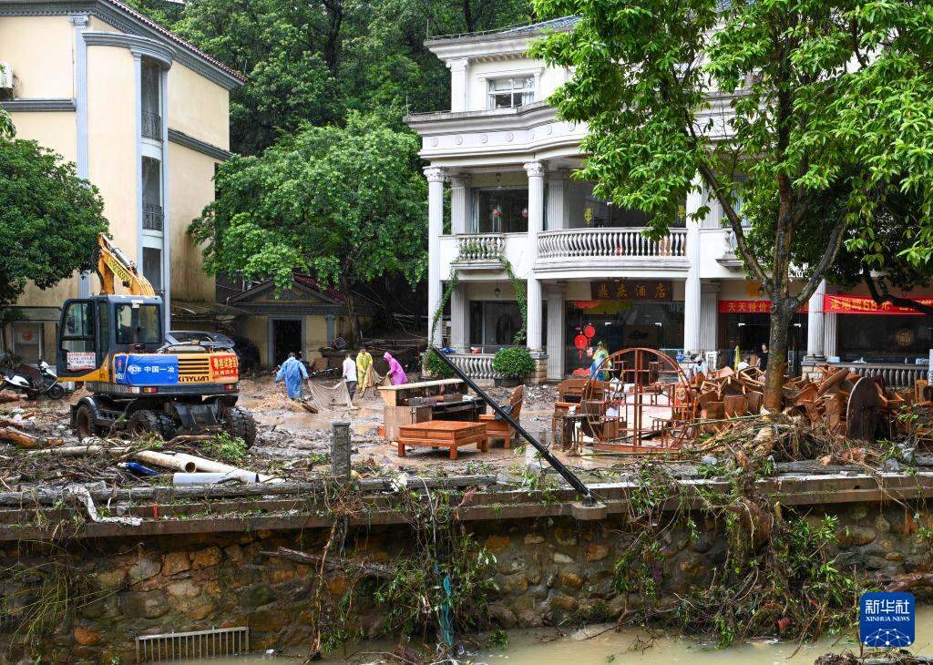 8月6日,在廣東清遠佛岡縣石角鎮(zhèn)黃花村,工作人員用挖掘機將村民清理出的淤泥與雜物轉(zhuǎn)移到拖拉機上統(tǒng)一清運。