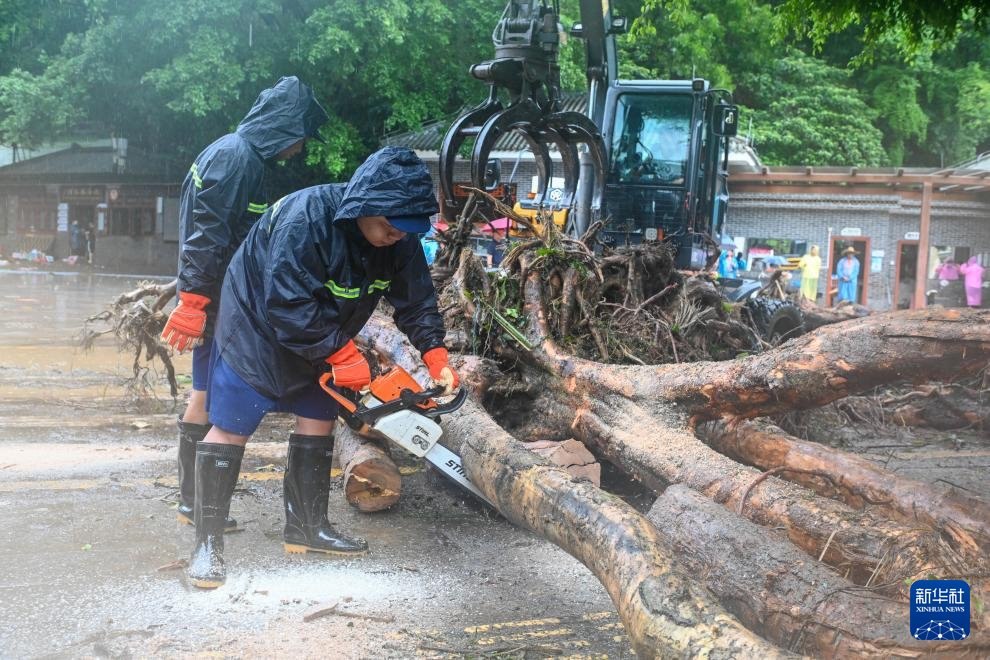 8月6日,工作人員在廣東肇慶鼎湖區(qū)鼎湖山風景區(qū)門口用電鋸切割被沖倒的樹木。