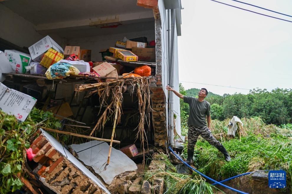 8月6日,廣東清遠佛岡縣石角鎮(zhèn)黃花村黨委書記李庚原在一棟被沖毀的房屋旁了解房屋受損情況。
