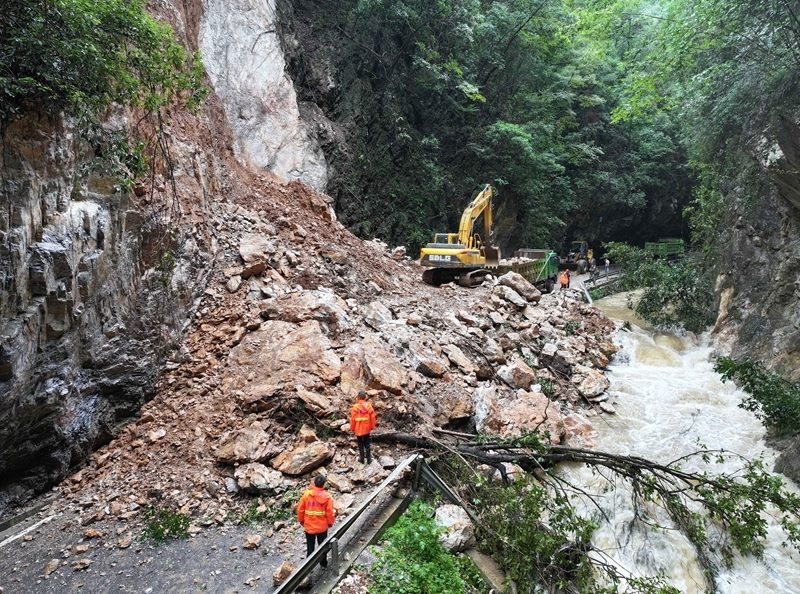 8月10日,在保康縣馬橋鎮(zhèn)堯(治河村)馬(橋鎮(zhèn))路6.2公里處,大型工程機(jī)械處置路旁崩塌的巖石。