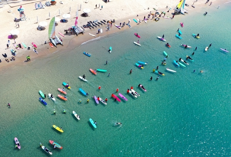 8月10日,游客在三亞市后海村附近海域沖浪嬉水(無人機(jī)照片)。