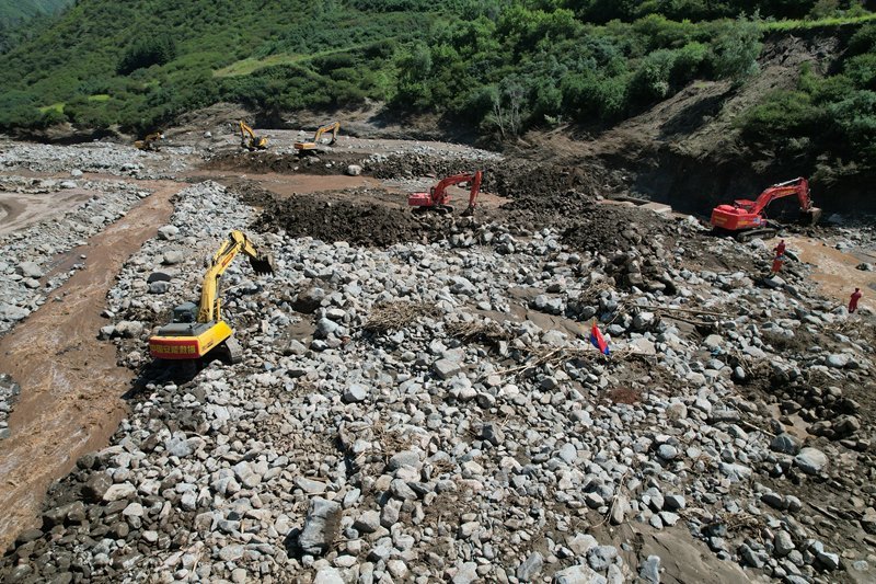 8月11日,在榆中縣馬坡鄉(xiāng)陽屲山村,中國安能救援隊使用挖掘機疏通清理山洪沖下的石頭。