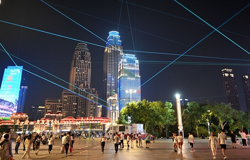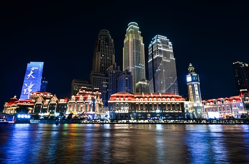 夜幕降臨,海河兩岸燈光璀璨絢麗,熱鬧非凡。市民和游客在天津海河畔漫步休閑,消暑納涼,領略城市光影之美。
