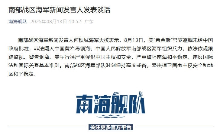 中國網(wǎng)8月13日訊 據(jù)“南海艦隊”微信公眾號消息,南部戰(zhàn)區(qū)海軍新聞發(fā)言人何鐵城海軍大校表示,8月13日,美“希金斯”號驅逐艦未經中國政府批準,非法闖入中國黃巖島領海,中國人民解放軍南部戰(zhàn)區(qū)海軍組織兵力,依法依規(guī)跟蹤監(jiān)視、警告驅離。美軍行徑嚴重侵犯中國主權和安全,嚴重破壞南海和平穩(wěn)定,違反國際法和國際關系基本準則。南部戰(zhàn)區(qū)海軍部隊時刻保持高度戒備,堅決捍衛(wèi)國家主權安全和地區(qū)和平穩(wěn)定。