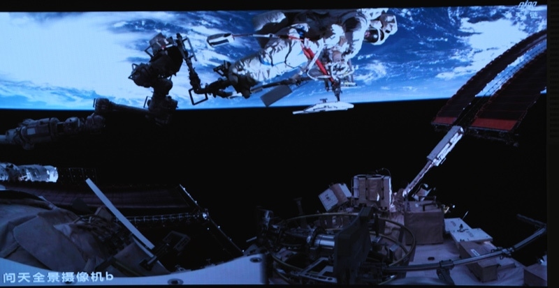 這是8月15日在北京航天飛行控制中心屏幕上拍攝的神舟二十號(hào)乘組航天員陳冬(左)與王杰在艙外工作的畫面(視頻截圖)。新華社記者 殷家捷 攝