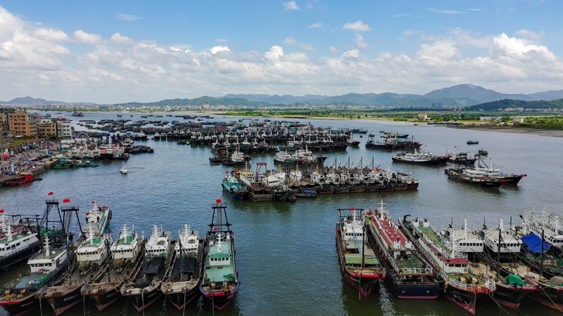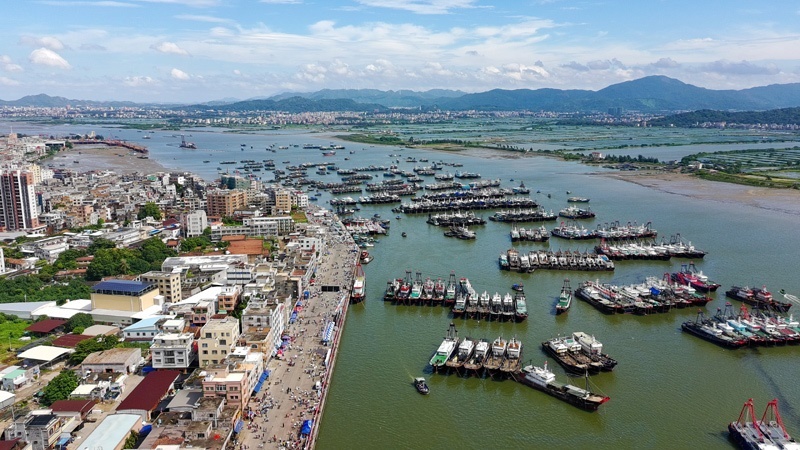 8月16日,停泊在博賀漁港的漁船等待開漁(無人機照片)。