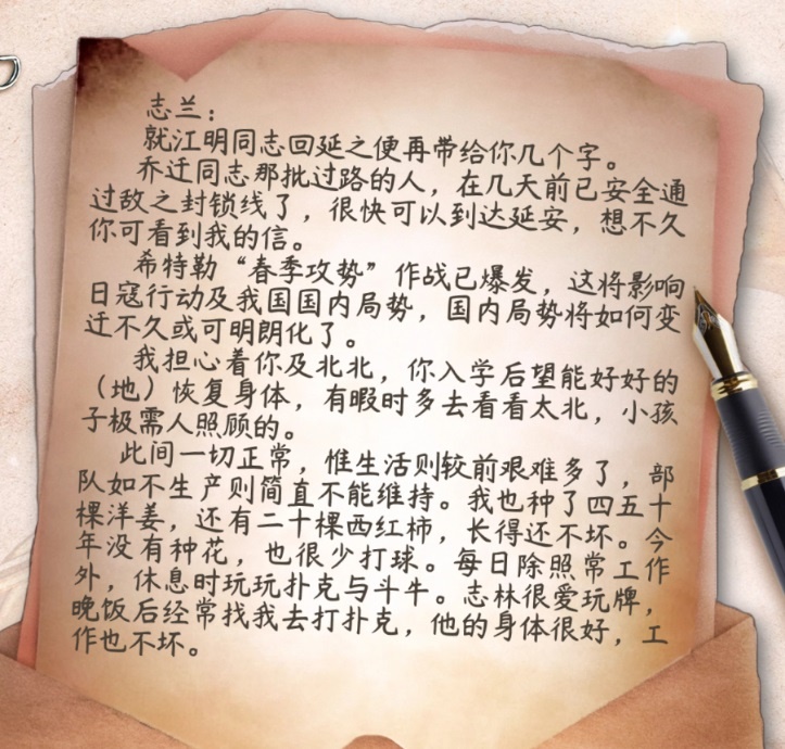 5月22日,日軍離八路軍總部只有十幾公里了,在這樣一個(gè)危急時(shí)刻,得知有人要去延安,左權(quán)決定給妻子劉志蘭寫一封信,回答她的問題。