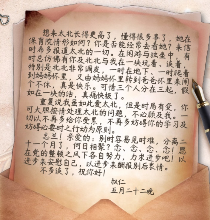 在信的最后,左權(quán)不得不忍痛交代妻子:“我雖如此愛太北,但是時(shí)局有變,你可大膽按情處理太北的問題,不必顧及我。”并勉勵(lì)妻子以進(jìn)步來安慰自己,以進(jìn)步來酬報(bào)別后衷情。