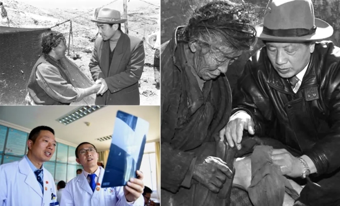 左上圖為來自陜西的援藏干部、阿里日土縣副縣長賈冗勇深入牧區(qū),幫助藏族牧民解決生產(chǎn)、生活的實際困難(新華社記者土登攝,1997年11月11日發(fā));左下圖為2017年8月3日,北京積水潭醫(yī)院援藏醫(yī)生龔曉峰(右)和北京天壇醫(yī)院援藏醫(yī)生李家謀在拉薩市人民醫(yī)院骨科病房內(nèi)查看患者的X光片(新華社記者晉美多吉攝);右圖為孔繁森(右)在阿里日土縣過巴鄉(xiāng)為孤寡老人益西卓瑪治病(新華社記者土登攝,1994年12月26日發(fā))。