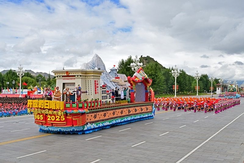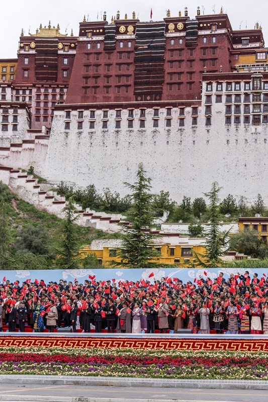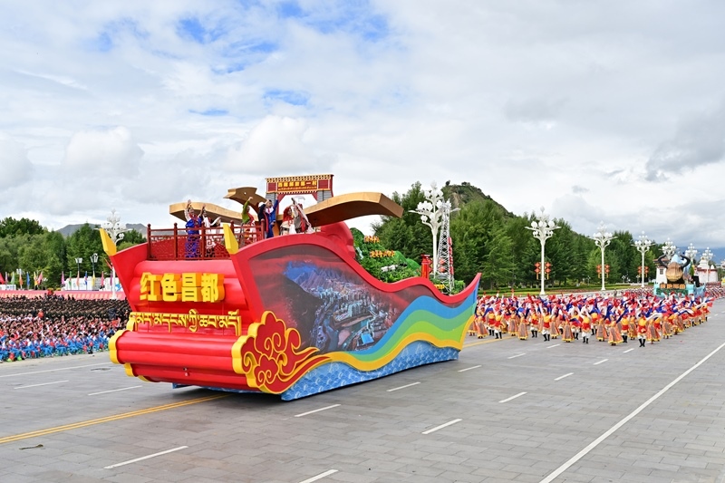 8月21日上午,西藏各族各界干部群眾約2萬人歡聚拉薩市布達(dá)拉宮廣場,熱烈慶祝西藏自治區(qū)成立60周年。這是游行的彩車通過布達(dá)拉宮廣場。