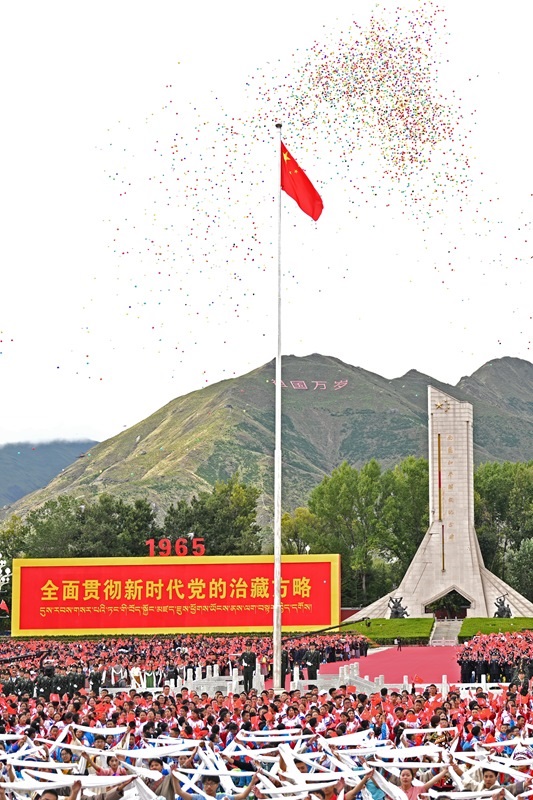 8月21日上午,西藏各族各界干部群眾約2萬人歡聚拉薩市布達(dá)拉宮廣場,熱烈慶祝西藏自治區(qū)成立60周年。這是慶祝大會(huì)現(xiàn)場。