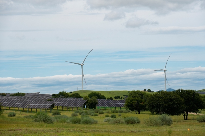 在內(nèi)蒙古興安盟中廣核科右中旗防沙治沙和風(fēng)電光伏一體化項目場地拍攝的風(fēng)機(jī)和光伏陣列(7月29日攝)。