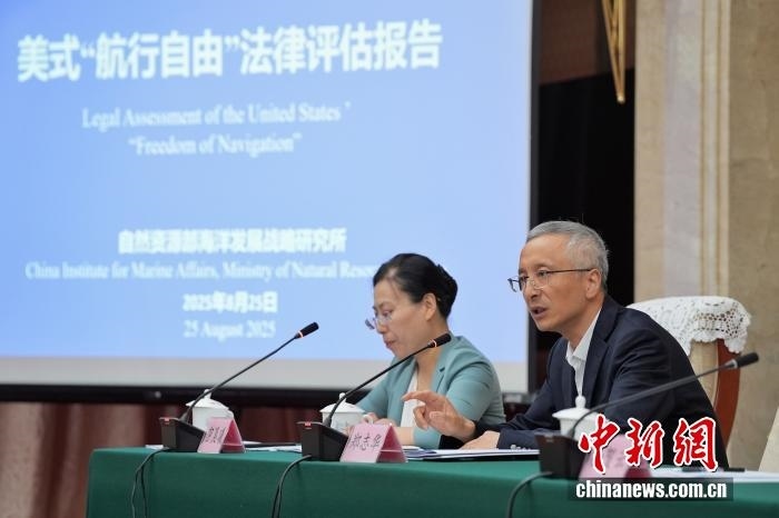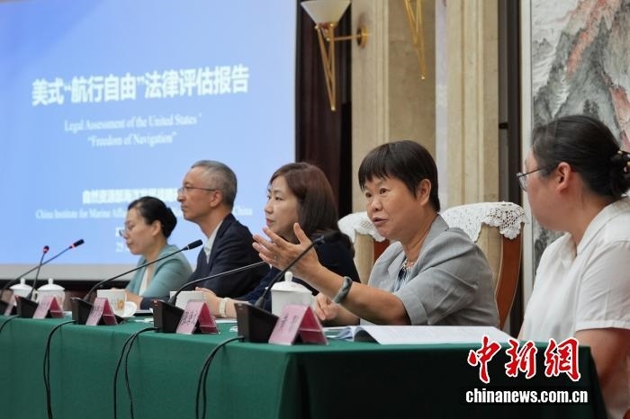 8月25日,中國自然資源部海洋發(fā)展戰(zhàn)略研究所在北京發(fā)布《美式“航行自由”法律評(píng)估報(bào)告》中英文版。該《報(bào)告》旨在對(duì)美國“航行自由”相關(guān)主張和實(shí)踐是否符合國際條約和一般國際法、是否具備法律基礎(chǔ)進(jìn)行評(píng)估。圖為自然資源部海洋發(fā)展戰(zhàn)略研究所前所長張海文(右二)答記者問。中新社記者 張祥毅 攝