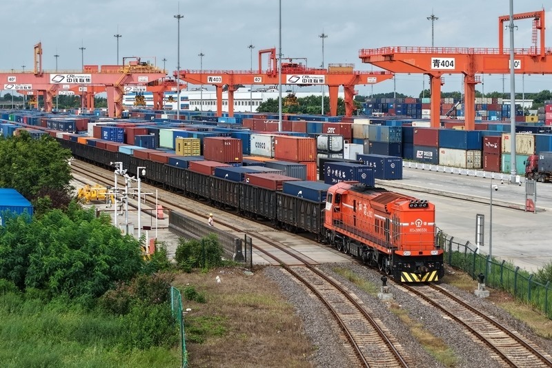 8月27日,貨運列車駛?cè)胛挥谏虾鲜痉秴^(qū)內(nèi)的中國-上海合作組織地方經(jīng)貿(mào)合作示范區(qū)多式聯(lián)運中心(無人機照片)。