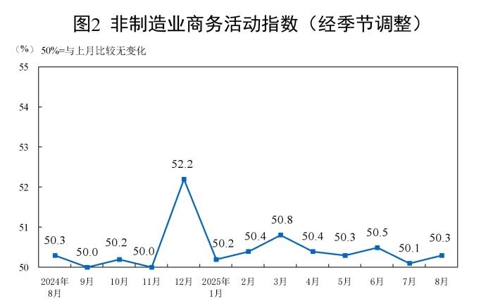 8月份,非制造業(yè)商務(wù)活動(dòng)指數(shù)為50.3%,比上月上升0.2個(gè)百分點(diǎn),高于臨界點(diǎn),非制造業(yè)繼續(xù)保持?jǐn)U張。