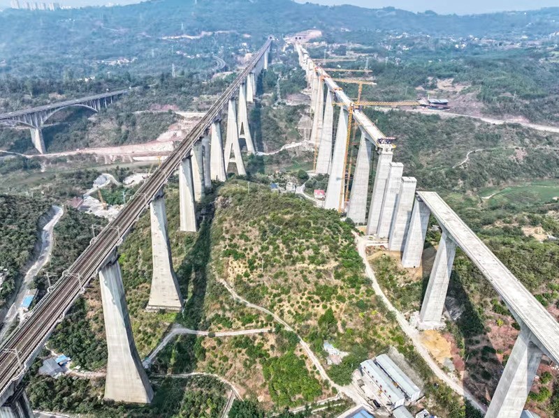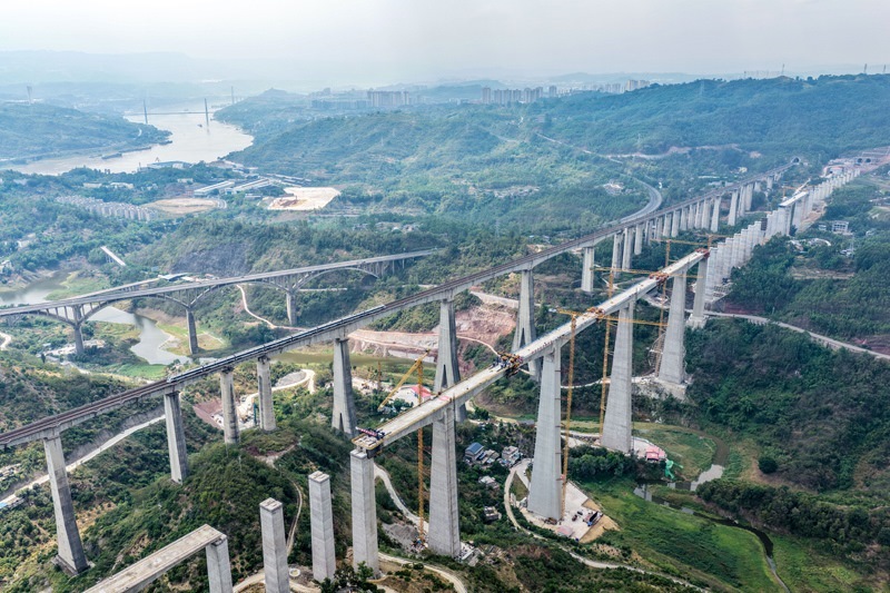 蔡家溝雙線特大橋位于重慶市涪陵區(qū),橫跨長江支流,是全線重難點(diǎn)工程。大橋主跨采用連續(xù)剛構(gòu)設(shè)計(jì),整體呈“兩端短、中間長”的對稱結(jié)構(gòu),總跨度達(dá)584米。