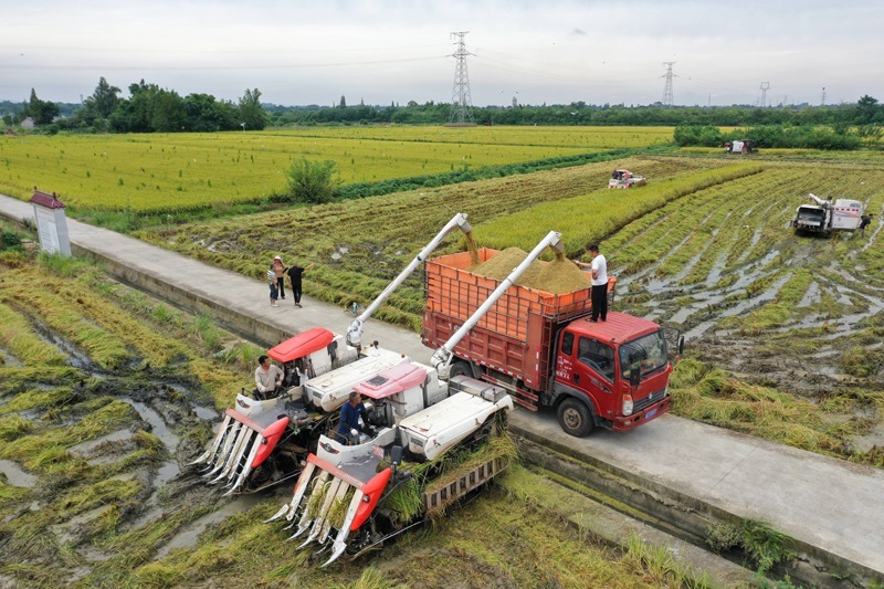 8月31日,在四川省眉山市東坡區(qū)太和鎮(zhèn),村民利用收割機(jī)搶收水稻(無人機(jī)照片)。