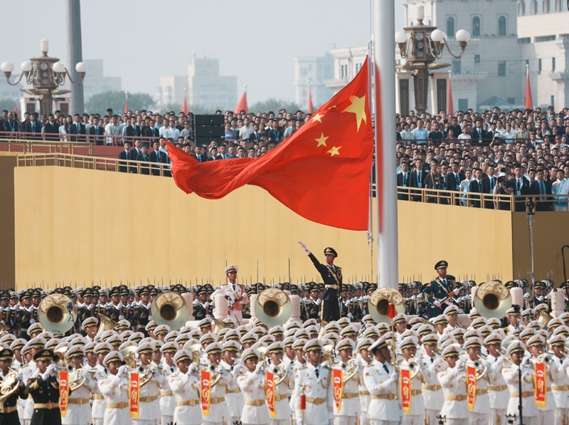 9月3日,紀(jì)念中國人民抗日戰(zhàn)爭暨世界反法西斯戰(zhàn)爭勝利80周年大會在北京隆重舉行。這是天安門廣場舉行隆重的升國旗儀式。