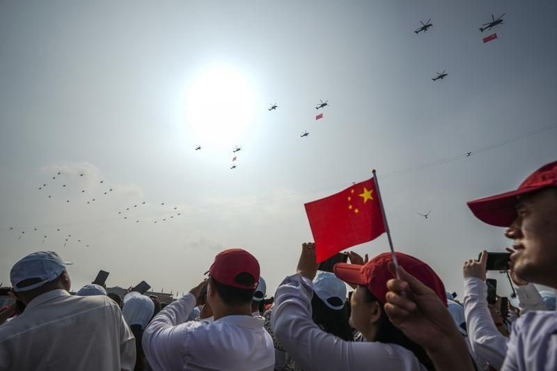 9月3日,紀念中國人民抗日戰(zhàn)爭暨世界反法西斯戰(zhàn)爭勝利80周年大會在北京隆重舉行。這是空中護旗梯隊飛過天安門廣場上空,26架直升機匯成巨大的“80”字樣。