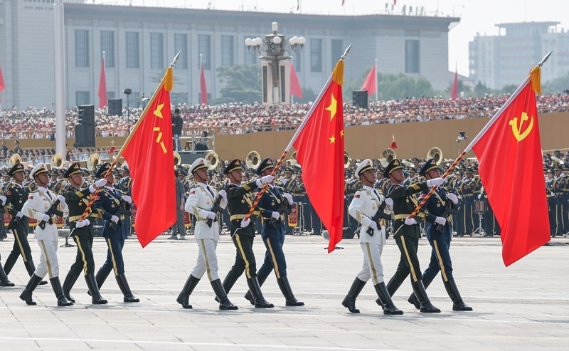 9月3日,紀(jì)念中國(guó)人民抗日戰(zhàn)爭(zhēng)暨世界反法西斯戰(zhàn)爭(zhēng)勝利80周年大會(huì)在北京隆重舉行。這是戰(zhàn)旗方隊(duì)接受檢閱。