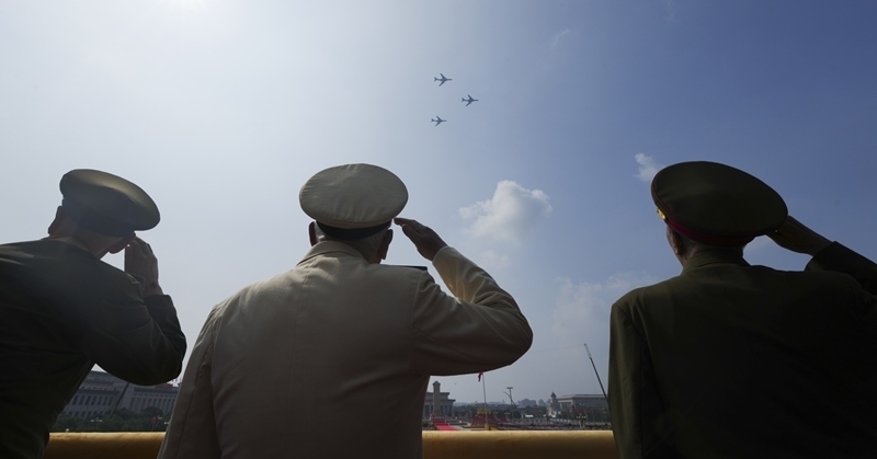 9月3日,紀(jì)念中國(guó)人民抗日戰(zhàn)爭(zhēng)暨世界反法西斯戰(zhàn)爭(zhēng)勝利80周年大會(huì)在北京隆重舉行。這是轟炸機(jī)梯隊(duì)飛過(guò)天安門(mén)廣場(chǎng)上空時(shí)嘉賓敬禮。