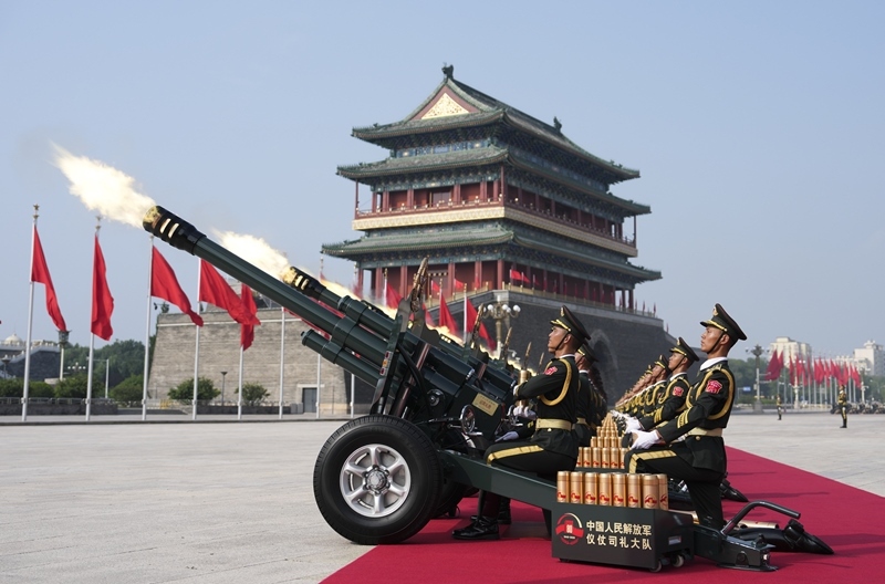 2025年9月3日,紀(jì)念中國人民抗日戰(zhàn)爭暨世界反法西斯戰(zhàn)爭勝利80周年大會在北京隆重舉行。這是禮炮在天安門廣場鳴響。新華社記者 牟宇 攝