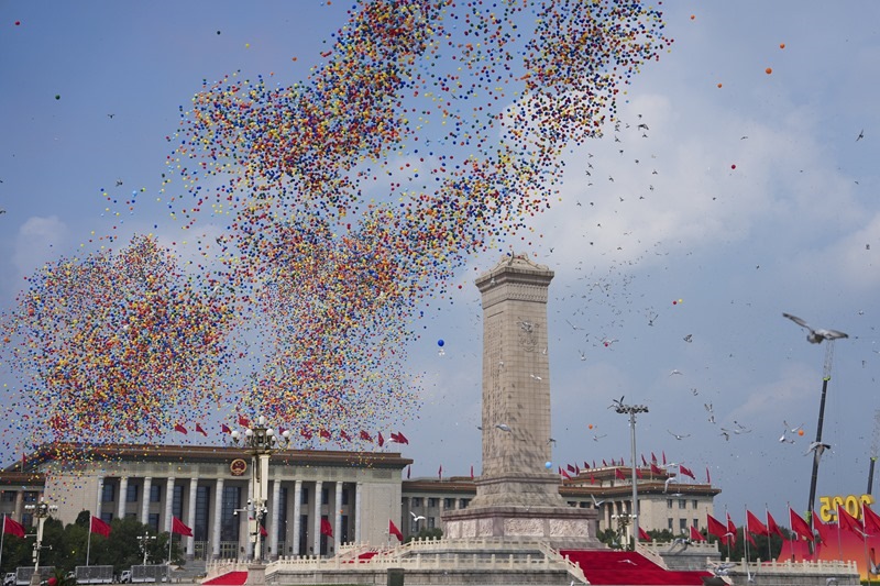 2025年9月3日,紀(jì)念中國人民抗日戰(zhàn)爭暨世界反法西斯戰(zhàn)爭勝利80周年大會在北京隆重舉行。這是紀(jì)念大會現(xiàn)場放飛氣球和鴿子。新華社記者 牟宇 攝