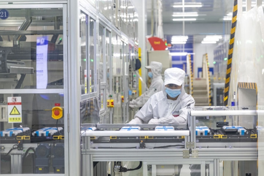 2024年9月27日,在位于重慶市銅梁區(qū)的海辰儲(chǔ)能重慶制造基地,工作人員在生產(chǎn)線上初步檢測(cè)兩個(gè)電芯是否配對(duì)。新華社記者 黃偉 攝