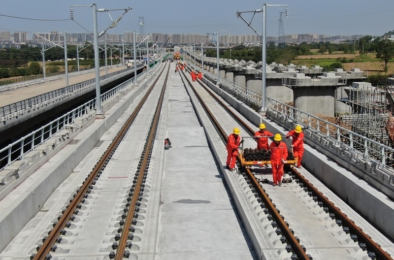 9月8日,施工車輛在西十高鐵西安東至藍(lán)田區(qū)間鋪設(shè)無(wú)縫鋼軌(無(wú)人機(jī)照片)。