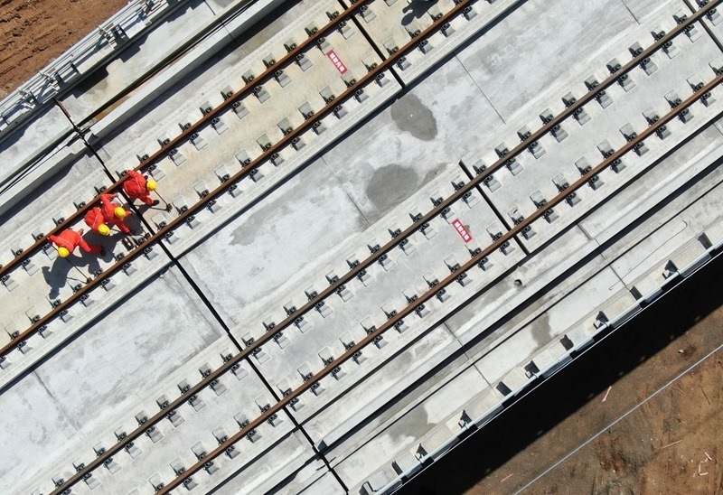 9月8日,施工人員在西十高鐵西安東至藍(lán)田區(qū)間鋪設(shè)無(wú)縫鋼軌(無(wú)人機(jī)照片)。