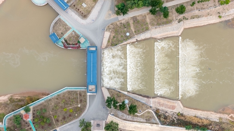 10月16日,用于灌溉的黃河水流經內蒙古巴彥淖爾市臨河區(qū)境內的總干渠第二分水樞紐(無人機照片)。