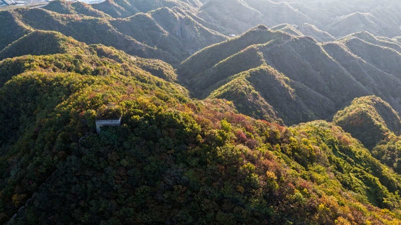 10月18日在河北省唐山市遷西縣上營鎮(zhèn)拍攝的青山關(guān)長城秋景(無人機照片)。