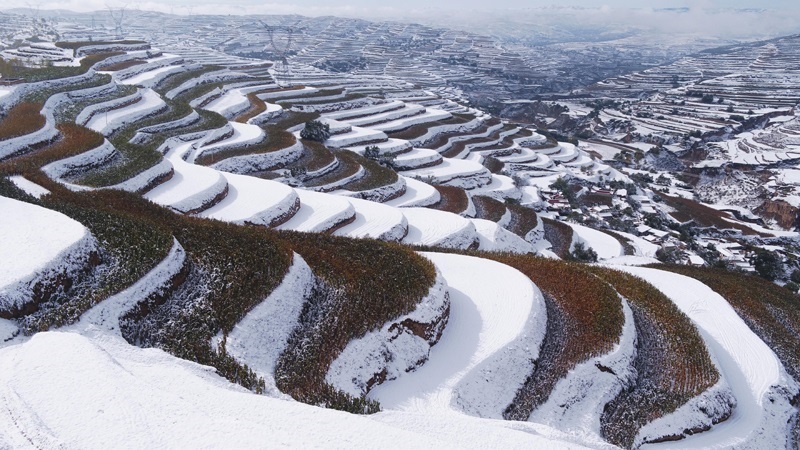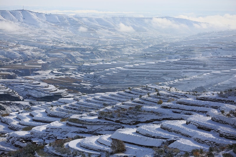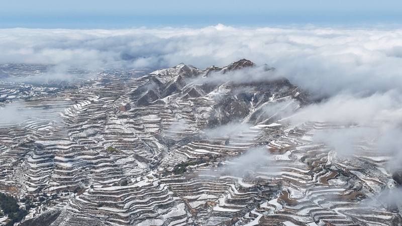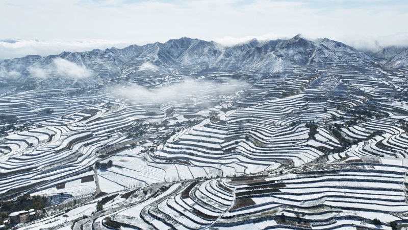 這是10月17日在甘肅永靖縣陳井鎮(zhèn)拍攝的雪后梯田(無人機照片)。