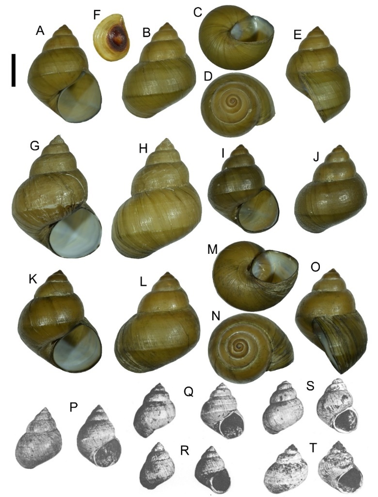 李四光婭田螺的現(xiàn)生個體貝殼(A—O)以及發(fā)現(xiàn)于第四紀沉積層的貝殼模式標本(P—T)。(中國科學院昆明動物研究所東南亞野生動物多樣性課題組供圖)