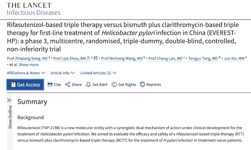 北京大學(xué)第三醫(yī)院消化科周麗雅、宋志強(qiáng)教授團(tuán)隊帶領(lǐng)全國40家醫(yī)療機(jī)構(gòu)消化疾病診療中心,通過全球首個Ⅲ期臨床試驗(yàn),證實(shí)了含利福特尼唑的三聯(lián)方案,比臨床上常用的鉍劑四聯(lián)方案具有更高的根除成功率和更低的不良反應(yīng)發(fā)生率,而且用藥更少,服用更方便,將為全球幽門螺桿菌感染者帶來了全新的治療選擇。相關(guān)成果日前于《柳葉刀-感染病學(xué)》在線發(fā)表。