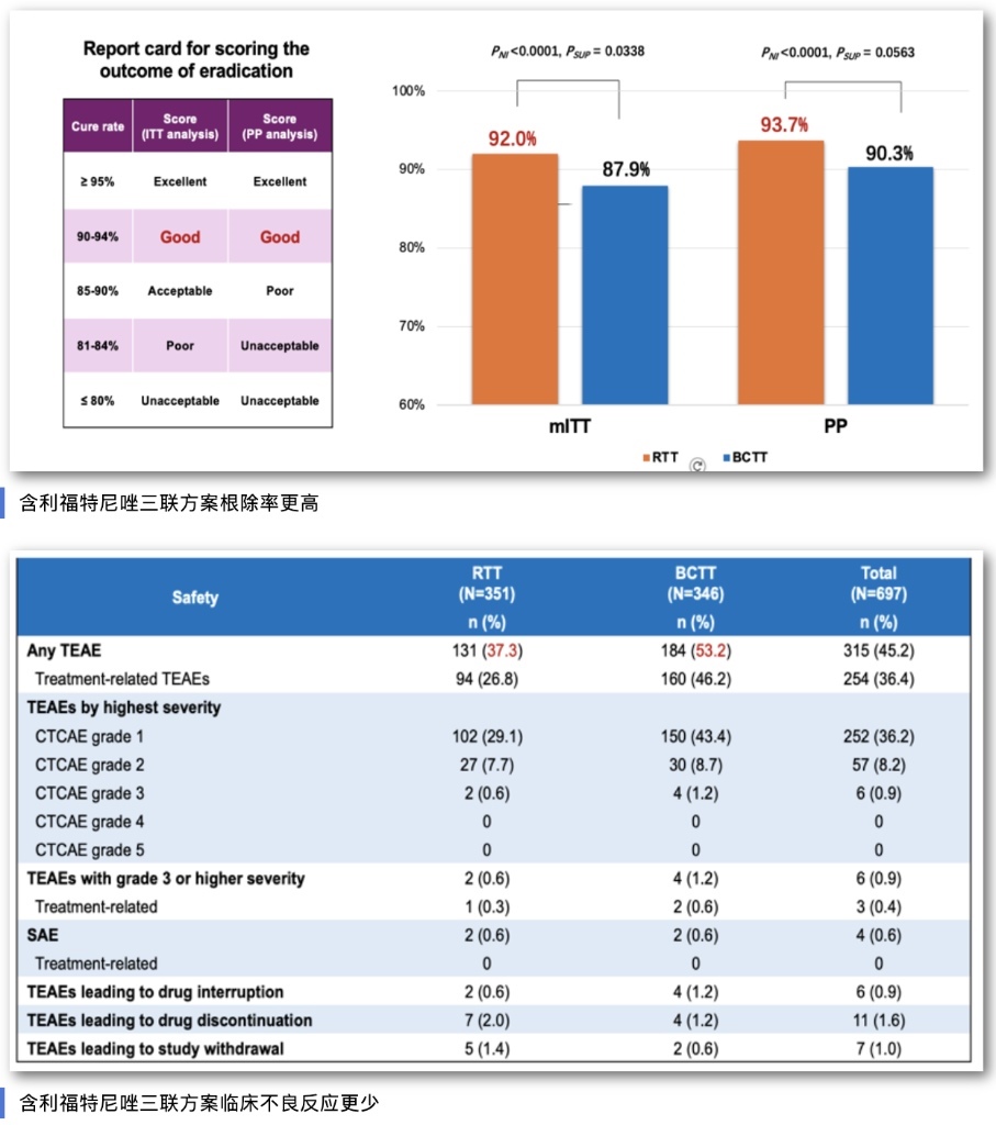 這項(xiàng)在中國開展的多中心、隨機(jī)、雙盲、陽性對照研究,納入700例幽門螺桿菌感染初治患者。宋志強(qiáng)介紹,利福特尼唑是我國自主研發(fā)的全球首創(chuàng)新型分子實(shí)體藥物,專門針對幽門螺桿菌感染研發(fā)。相關(guān)基礎(chǔ)和臨床研究結(jié)果均顯示,幽門螺桿菌對該藥物普遍敏感,最小抑菌濃度低,有效克服幽門螺桿菌高耐藥問題,而且表現(xiàn)出良好的安全性。