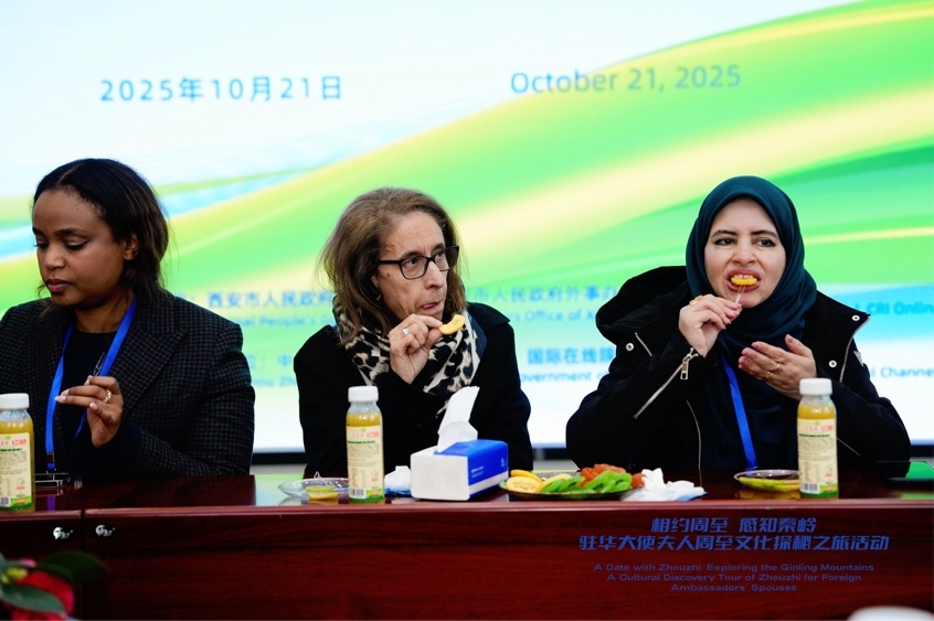 駐華大使夫人品嘗著不同品種的獼猴桃以及各式各樣的獼猴桃深加工食品,紛紛稱贊其細(xì)膩的口感、獨(dú)特的風(fēng)味和濃郁的果香?!斑@不僅是一次味覺的享受,更是一次對(duì)中國鄉(xiāng)村產(chǎn)業(yè)振興的直觀感受。”摩洛哥駐華大使夫人表示,“我非常期待后續(xù)可以和周至合作,因?yàn)槟β甯绾芟矚g這種水果,我也希望可以在這里學(xué)到一些產(chǎn)業(yè)發(fā)展的知識(shí),并把這些知識(shí)帶回我們國家?!?/p>