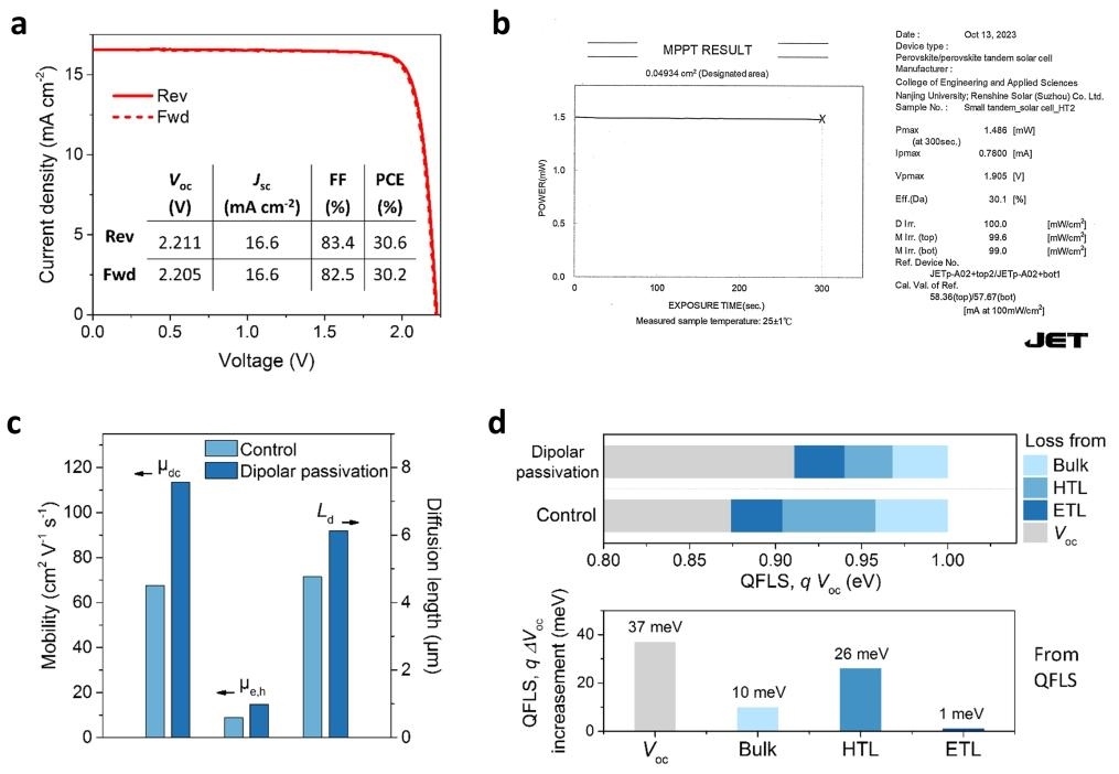 太赫茲輻射探測診斷結(jié)果清晰揭示了偶極鈍化策略在促進(jìn)電荷傳輸、抑制損耗等方面的微觀機(jī)制。實(shí)驗(yàn)數(shù)據(jù)顯示,經(jīng)鈍化處理的鈣鈦礦薄膜,總載流子遷移率提升68%以上,載流子擴(kuò)散長度延長近30%。