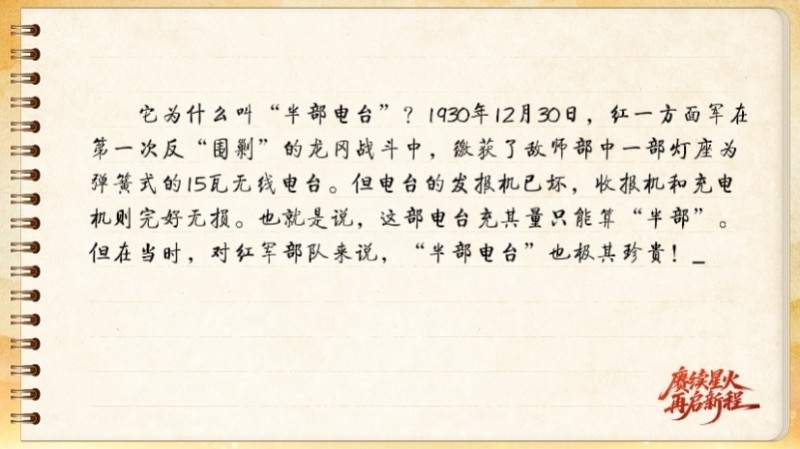 它為什么叫“半部電臺”?1930年12月30日,紅一方面軍在第一次反“圍剿”的龍岡戰(zhàn)斗中,繳獲了敵師部中一部燈座為彈簧式的15瓦無線電臺。但電臺的發(fā)報機已壞,收報機和充電機則完好無損。也就是說,這部電臺充其量只能算“半部”。但在當(dāng)時,對紅軍部隊來說,“半部電臺”也極其珍貴!
