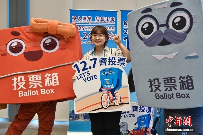 10月23日,香港特區(qū)政府和選舉管理委員會(huì)舉行2025年立法會(huì)換屆選舉啟動(dòng)禮,為第八屆立法會(huì)選舉揭開(kāi)序幕。圖為一名女士與“票箱家族”角色合影。 中新社記者 李志華 攝