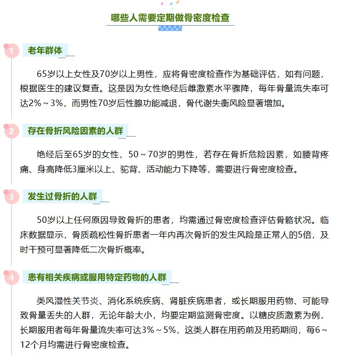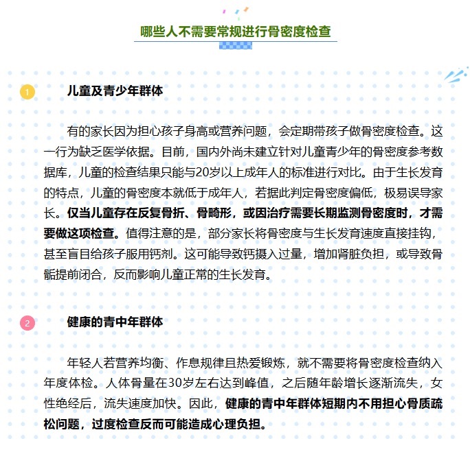 骨骼健康是人體健康的重要組成部分,其評(píng)估指標(biāo)不僅包括鈣含量,還涉及骨骼強(qiáng)度等多方面的因素,而骨密度在一定程度上,可以反映骨骼健康狀態(tài)。需要明確的是,并非人人都需要進(jìn)行骨密度檢查。而且,當(dāng)下流行的體脂秤及體檢中常用的超聲骨密度檢查,均不能作為診斷骨質(zhì)疏松癥的依據(jù)。正確認(rèn)識(shí)骨密度檢查的適用人群,既能避免醫(yī)療資源浪費(fèi),也能減少不必要的健康焦慮。