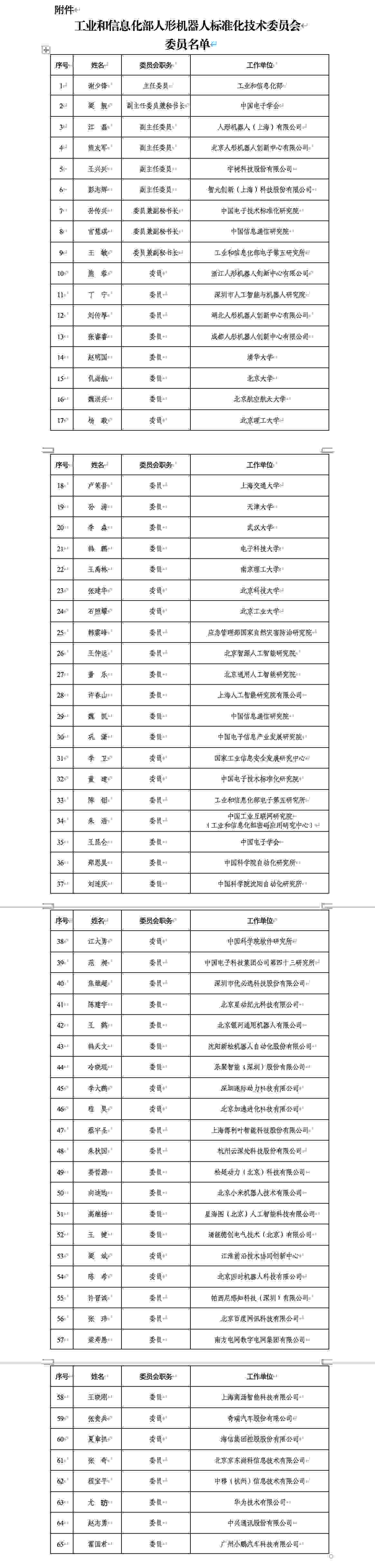 名單共包括65人,其中工業(yè)和信息化部謝少鋒為主任委員,中國(guó)電子學(xué)會(huì)梁靚為副主任委員兼秘書長(zhǎng),人形機(jī)器人(上海)有限公司江磊、北京人形機(jī)器人創(chuàng)新中心有限公司熊友軍、宇樹科技股份有限公司王興興、智元?jiǎng)?chuàng)新(上海)科技股份有限公司彭志輝為副主任委員,中國(guó)電子技術(shù)標(biāo)準(zhǔn)化研究院孫傳興、中國(guó)信息通信研究院宮慧琪、工業(yè)和信息化部電子第五研究所王敏為委員兼副秘書長(zhǎng)。