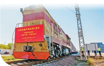 11月29日,一列滿載1000噸木薯淀粉的鐵路集裝箱班列從中老鐵路萬象南站駛出,準備發(fā)往河南鄭州。這是老撾首次成列運輸輸華的木薯淀粉。凱 喬攝(新華社發(fā))