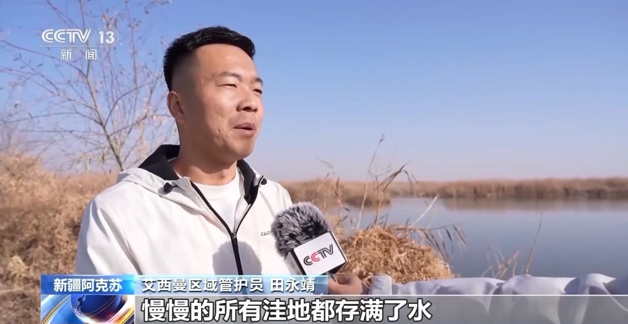 艾西曼區(qū)域管護(hù)員 田永靖:再生水過(guò)來(lái)之后,慢慢所有洼地都存滿了水,變成了現(xiàn)在所看到的濕地,這一大片的蘆葦現(xiàn)在長(zhǎng)勢(shì)都特別不錯(cuò)。