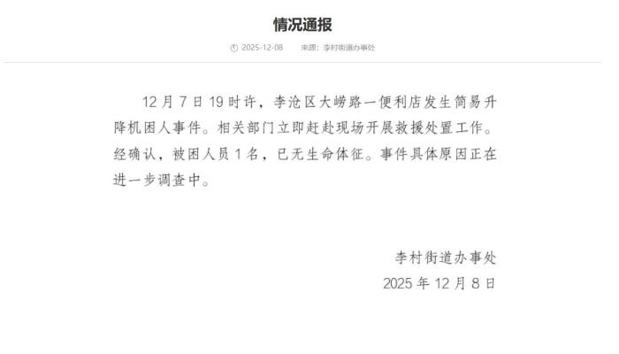 中新網(wǎng)12月8日電 青島李村街道辦事處8日在青島李滄政務(wù)網(wǎng)發(fā)布情況通報(bào)稱(chēng),12月7日19時(shí)許,李滄區(qū)大嶗路一便利店發(fā)生簡(jiǎn)易升降機(jī)困人事件。相關(guān)部門(mén)立即趕赴現(xiàn)場(chǎng)開(kāi)展救援處置工作。經(jīng)確認(rèn),被困人員1名,已無(wú)生命體征。事件具體原因正在進(jìn)一步調(diào)查中。