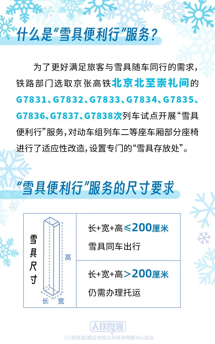 鐵路部門堅(jiān)持以人民為中心的發(fā)展思想,持續(xù)深化運(yùn)輸供給側(cè)結(jié)構(gòu)性改革,積極適應(yīng)旅客多樣化的出行需求,為攜帶雪具出行的旅客提供便捷服務(wù)。前期,鐵路部門按照《國(guó)鐵集團(tuán)鐵路旅客運(yùn)輸規(guī)程》“旅客乘坐動(dòng)車組列車隨身攜帶的行李物品長(zhǎng)、寬、高之和不超過(guò)130厘米”的規(guī)定,對(duì)超過(guò)上述尺寸標(biāo)準(zhǔn)的雪具推出了“雪具快運(yùn)”服務(wù)。為了更好滿足旅客與雪具隨車同行的需求,鐵路部門統(tǒng)籌考慮旅客安全、乘車秩序和雪具運(yùn)輸需求,選取京張高鐵北京北至崇禮間的G7831、G7832、G7833、G7834、G7835、G7836、G7837、G7838次列車試點(diǎn)開展“雪具便利行”服務(wù),對(duì)動(dòng)車組列車二等座車廂部分座椅進(jìn)行了適應(yīng)性改造,設(shè)置專門的“雪具存放處”,旅客選擇該服務(wù)后可攜帶長(zhǎng)、寬、高之和不超過(guò)200厘米的雪具同車出行,滑雪更加方便快捷。對(duì)于長(zhǎng)、寬、高之和超過(guò)200厘米的雪具,由于高鐵列車車內(nèi)空間限制,仍需辦理托運(yùn)。